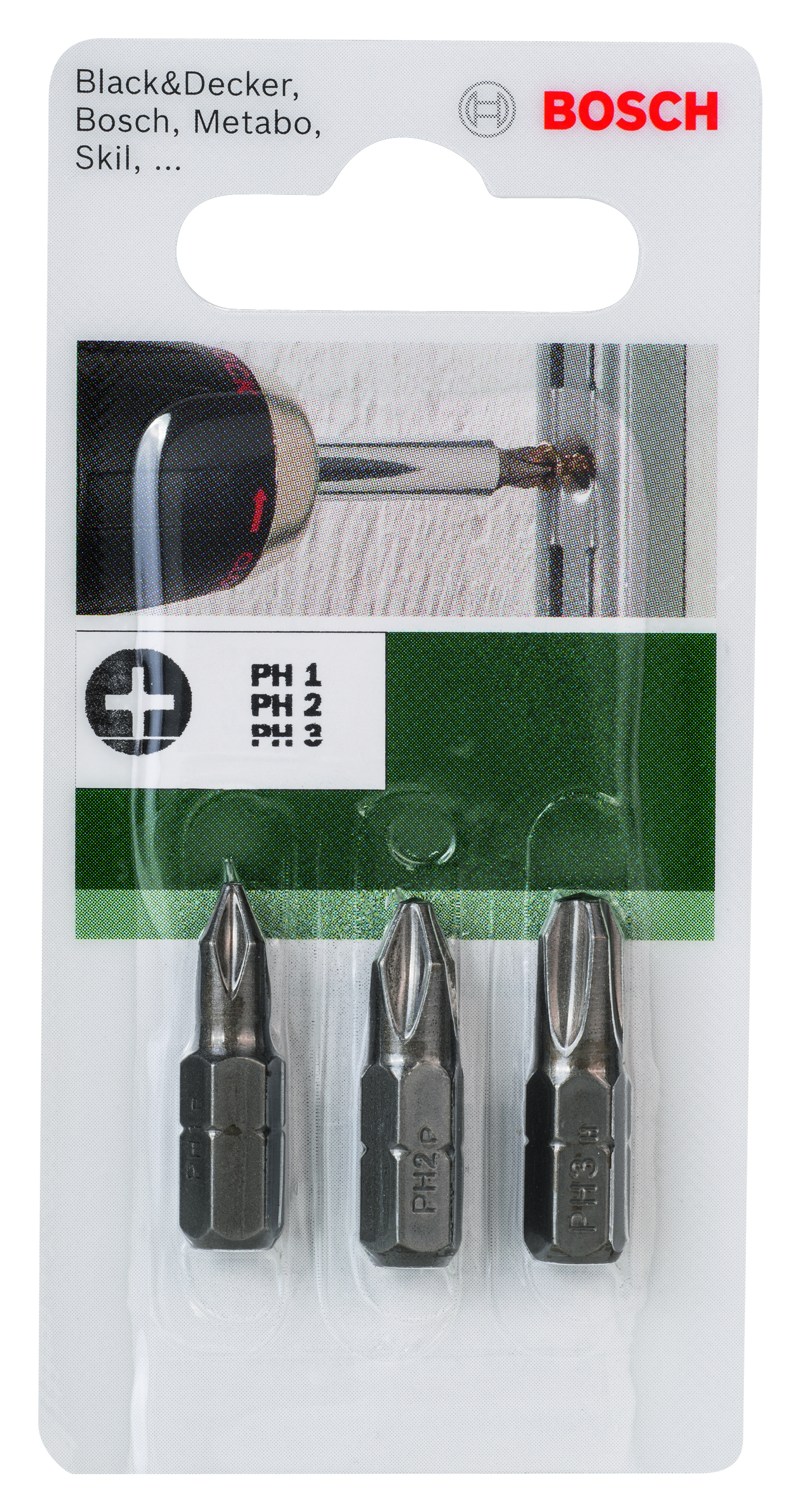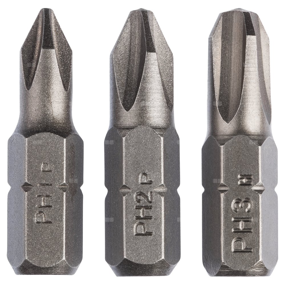 3-częściowy zestaw standardowych końcówek wkręcających do śrub z rowkiem krzyżowym Phillips (PH) PH1, PH2, PH3, 25 mm