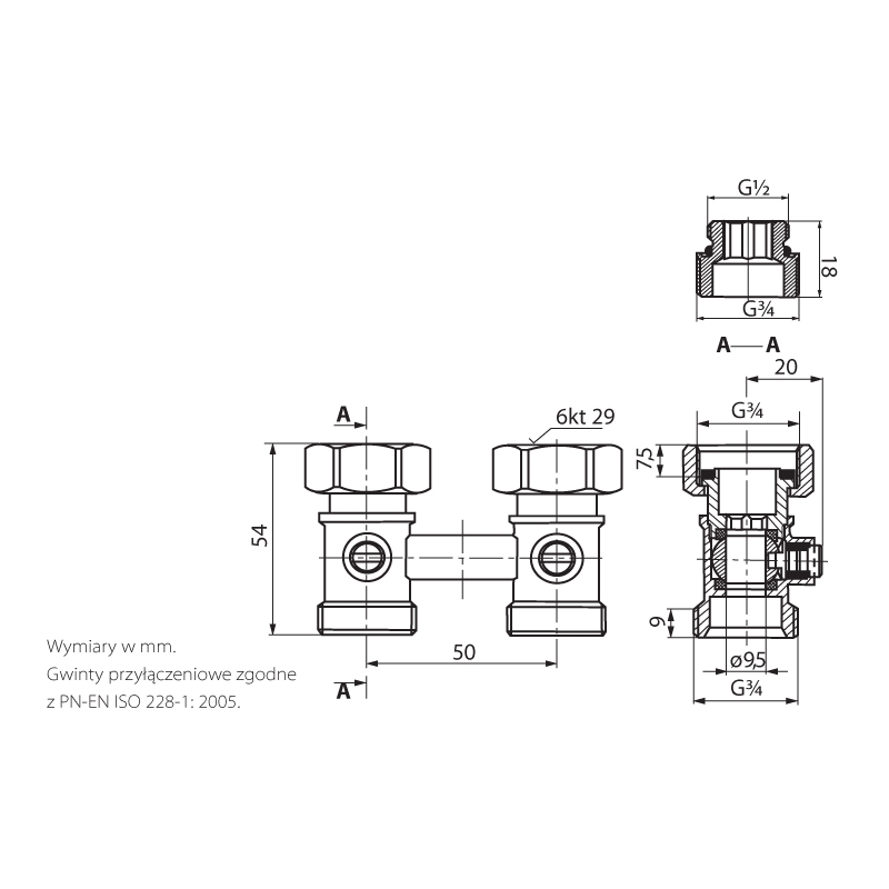 7006+8021 G1/2xG3/4 PN10 DN15 Zespół kurków kulowych grzejnikowych P CuZn-C PN-M-75002