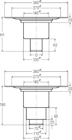 Advantix-korpus odpływu podłogowego nie występuje: nasadka, nr wzoru 4951.15 DN: 70/100 H1: 190 H2: 85 wydajność odpływu przy wysokości spiętrzenia 10 mm: 0.9 wydajność odpływu przy wysokości spiętrzenia 20 mm: 1.4 odpływ pionowy