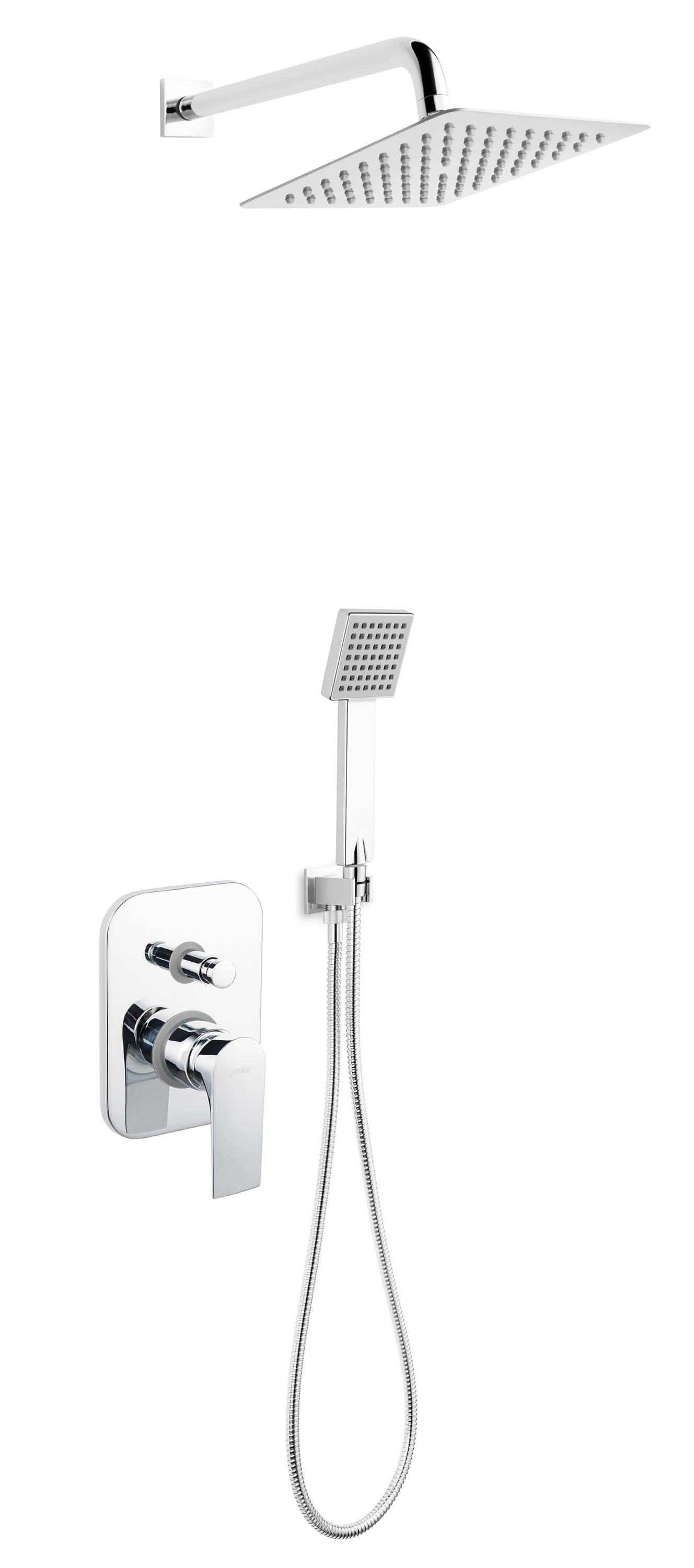 Kompletny podtynkowy zestaw natryskowy składający się z dwufunkcyjnej baterii w nowoczesnym stylu, wyposażonej w przełącznik z funkcją Anti-Stop. W zestawie znajdziemy także kwadratową deszczownicę w modnym designie typu slim z ramieniem prysznicowym, praktyczną rączkę natryskową z systemem łatwego usuwania kamienia Ferro Easy Clean, przyłącze kątowe z uchwytem i trwałym wężem prysznicowym w oplocie z metalu.