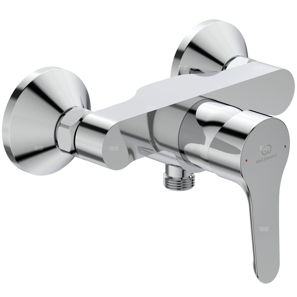Bateria natryskowa ścienna. Głowica ceramiczna 35 mm z ogranicznikiem temperatury. Metalowy uchwyt z nadrukowanymi czerwonymi i niebieskimi oznaczeniami. Zawór zwrotny. Przyłącza mimośrodowe. Zgodność z normą EN 817.
