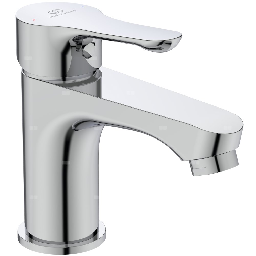 Bateria Alpha. Głowica ceramiczna 35 mm z ogranicznikiem temperatury. Metalowy uchwyt z nadrukowanymi czerwonymi i niebieskimi oznaczeniami. Aerator typu Perlator. Wężyki przyłączeniowe G3/8” do doprowadzenia wody.