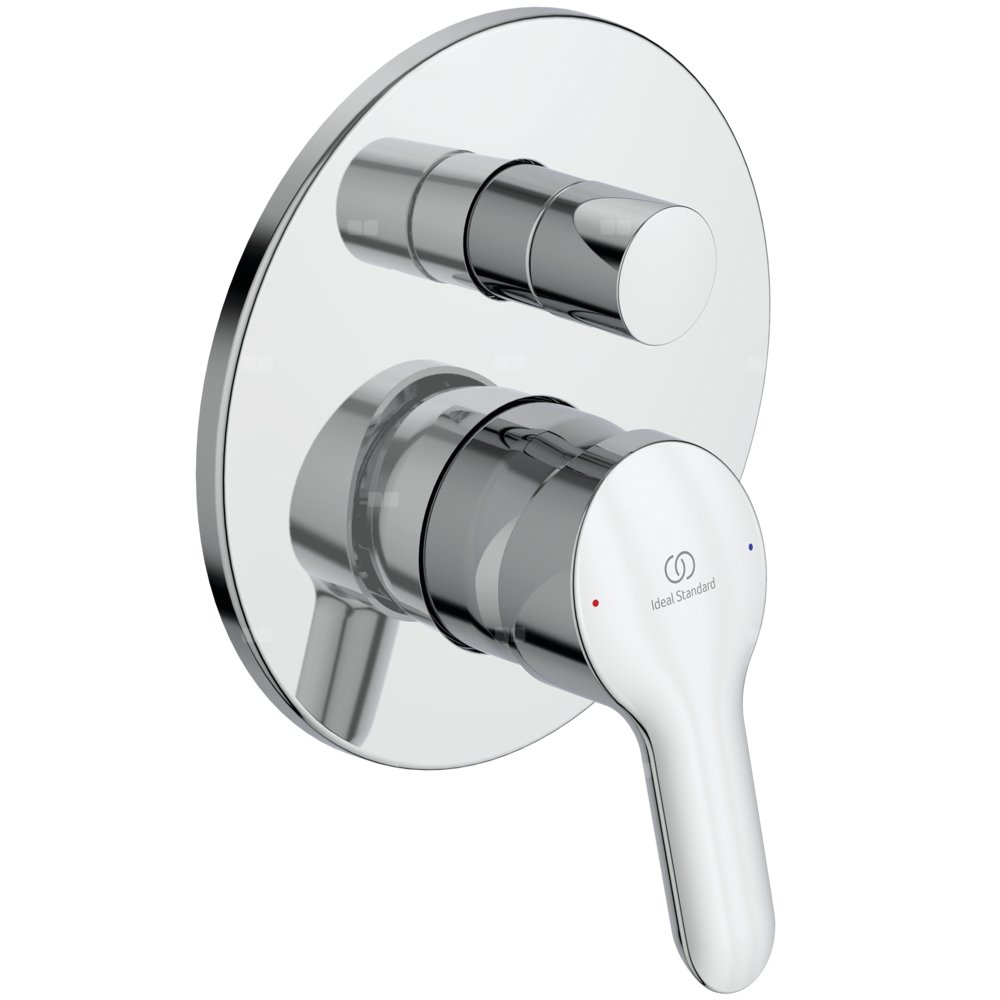 Zestaw montażowy podtynkowej baterii wannowo-natryskowej (kompletny). Automatyczny przełącznik. Głowica IS 47 mm CLICK. Metalowy uchwyt z nadrukowanymi czerwonymi i niebieskimi oznaczeniami. Chromowana rozeta z tworzywa.