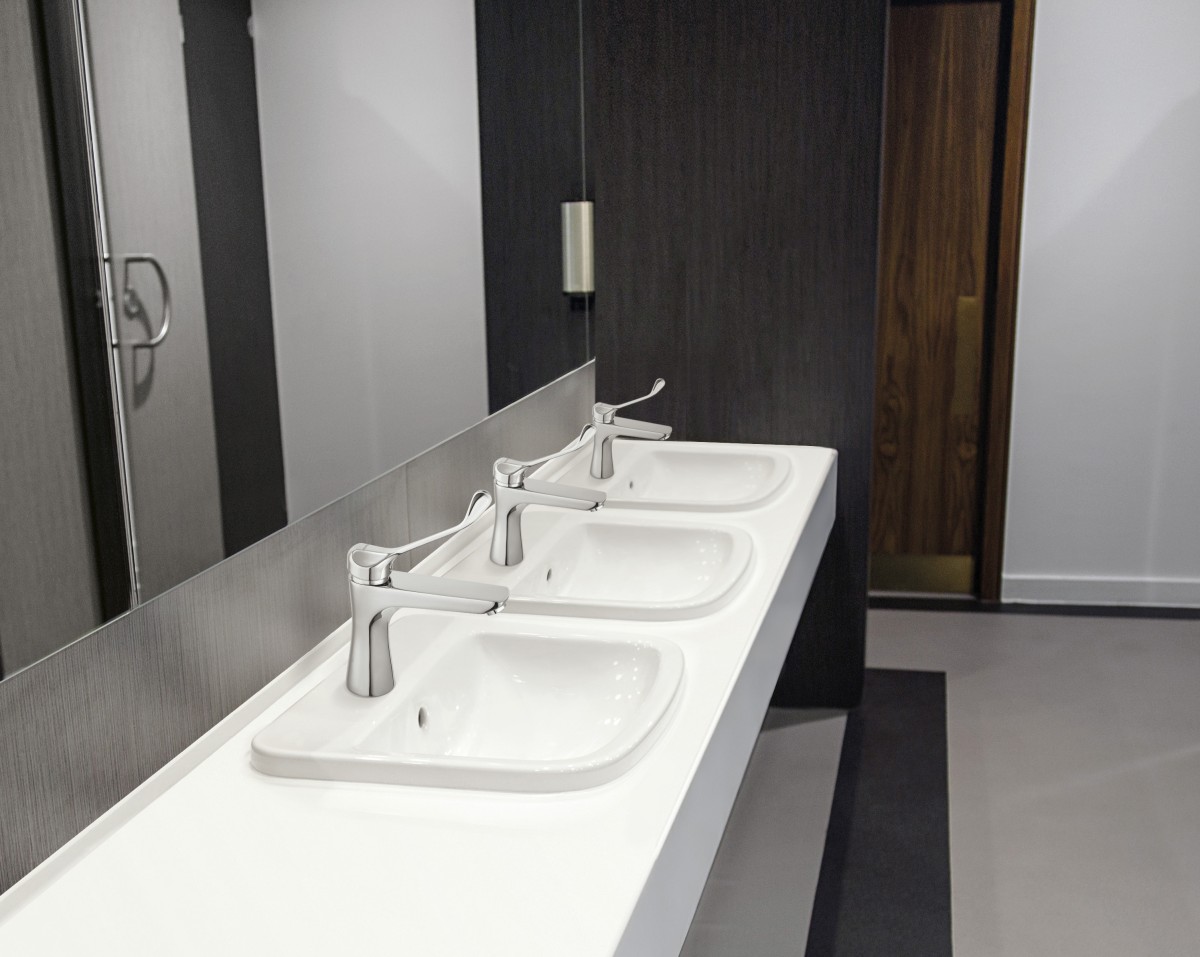 Bateria umywalkowa o delikatnym kształcie z prostokątnym uchwytem. Produkt posiada uchwyt medyczny z przedłużoną dźwignią, który ułatwia regulacje strumienia oraz temperatury wody.