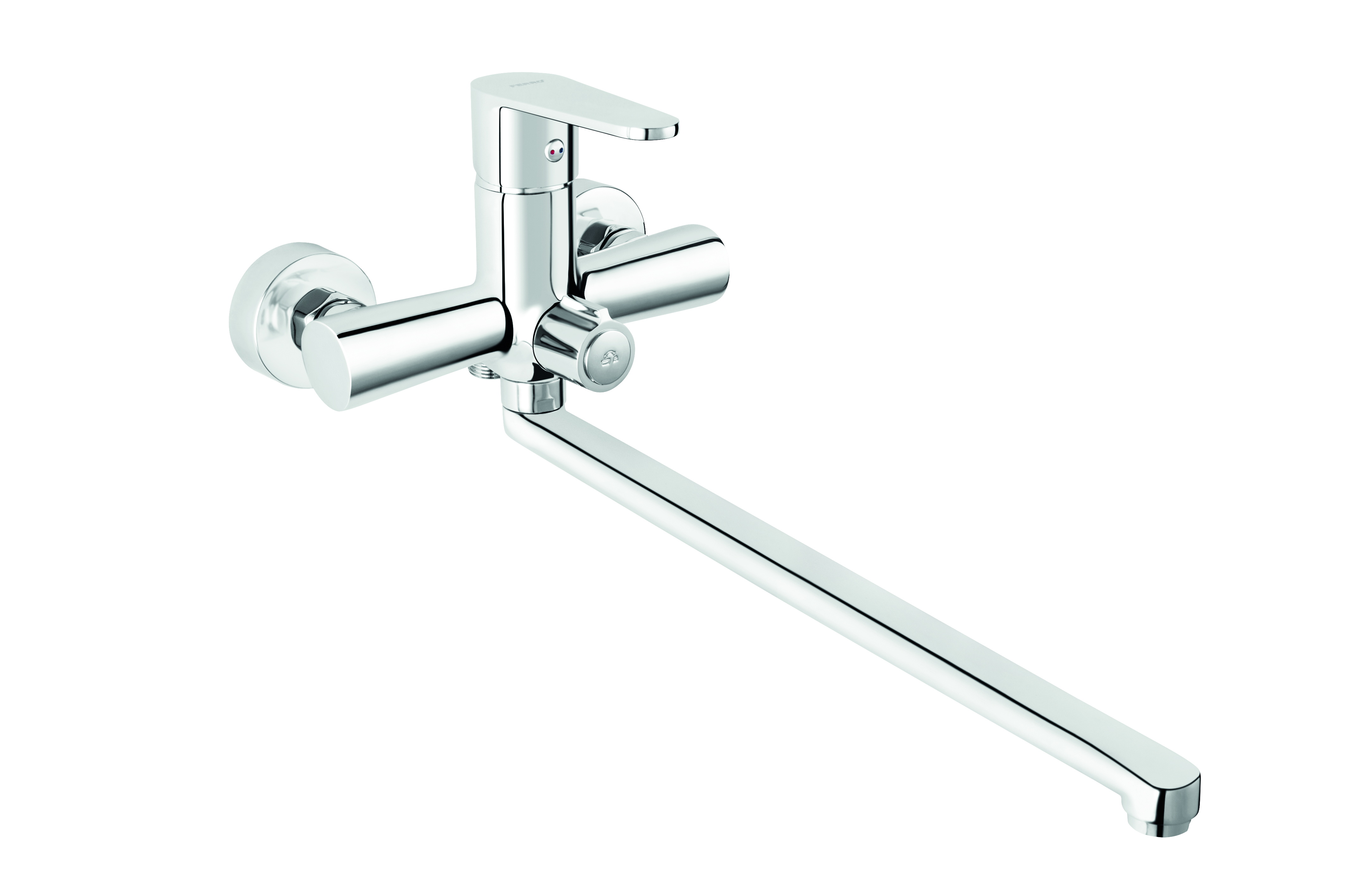 Bateria umywalkowo-wannowa z funkcjonalną, ruchomą wylewką. Uniwersalne przyłącze 1/2" umożliwia zastosowanie dowolnego zestawu natryskowego. Ceramiczny, ergonomiczny przełącznik wylewka/natrysk zapewnia łatwość w obsłudze.