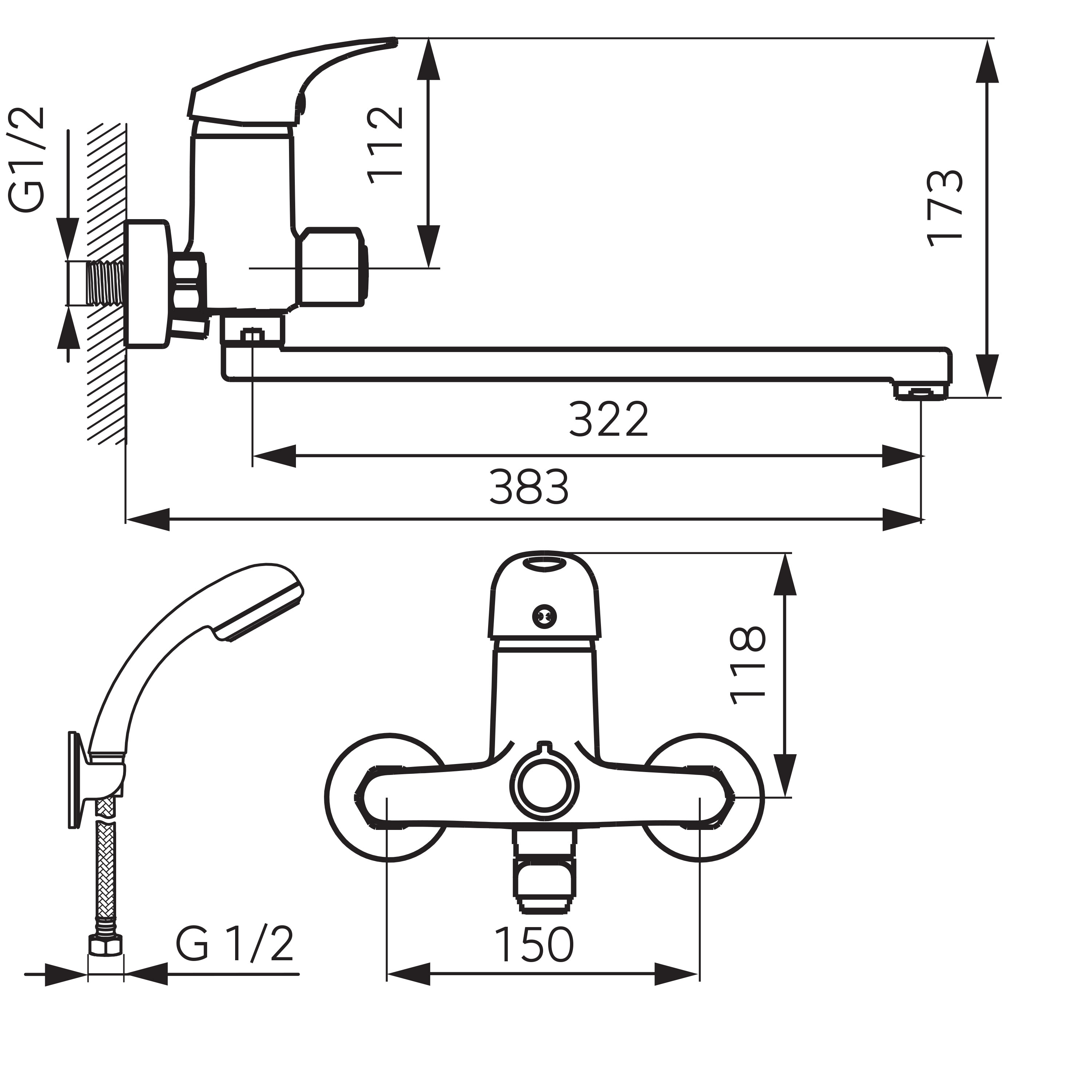 Bateria wannowo-umywalkowa ścienna FERRO FERRO ONE, chrom, z przyłączem natrysku, z zestawem natryskowym