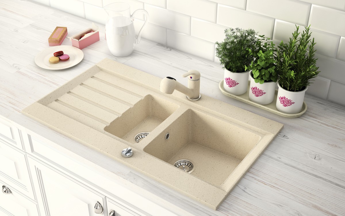 Bateria zlewozmywakowa stojąca FERRO FREYA, kolor piasek, z wyciąganym natryskiem