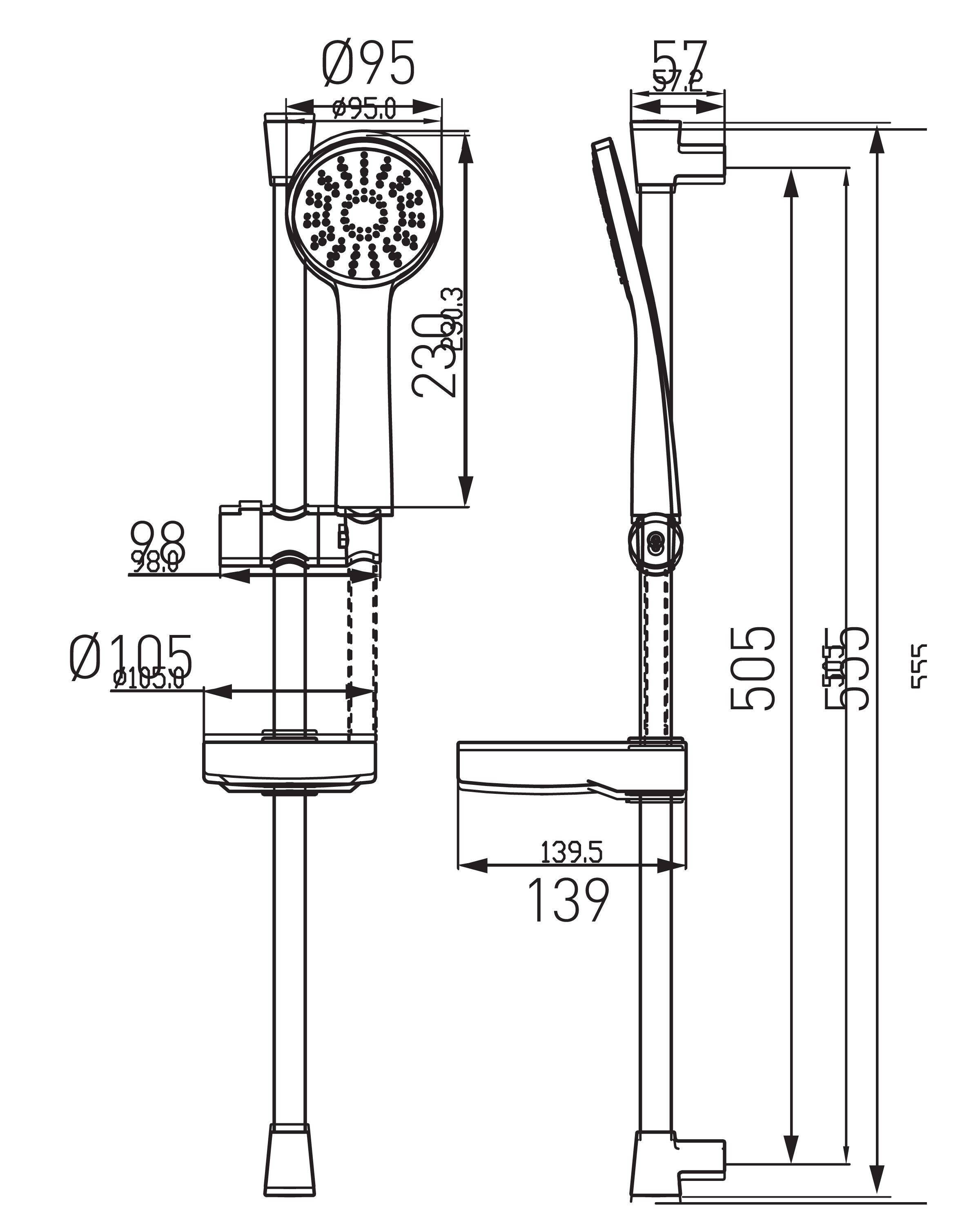 Zestaw składający się z klasycznej rączki natryskowej z funkcją strumienia typu deszcz, drą