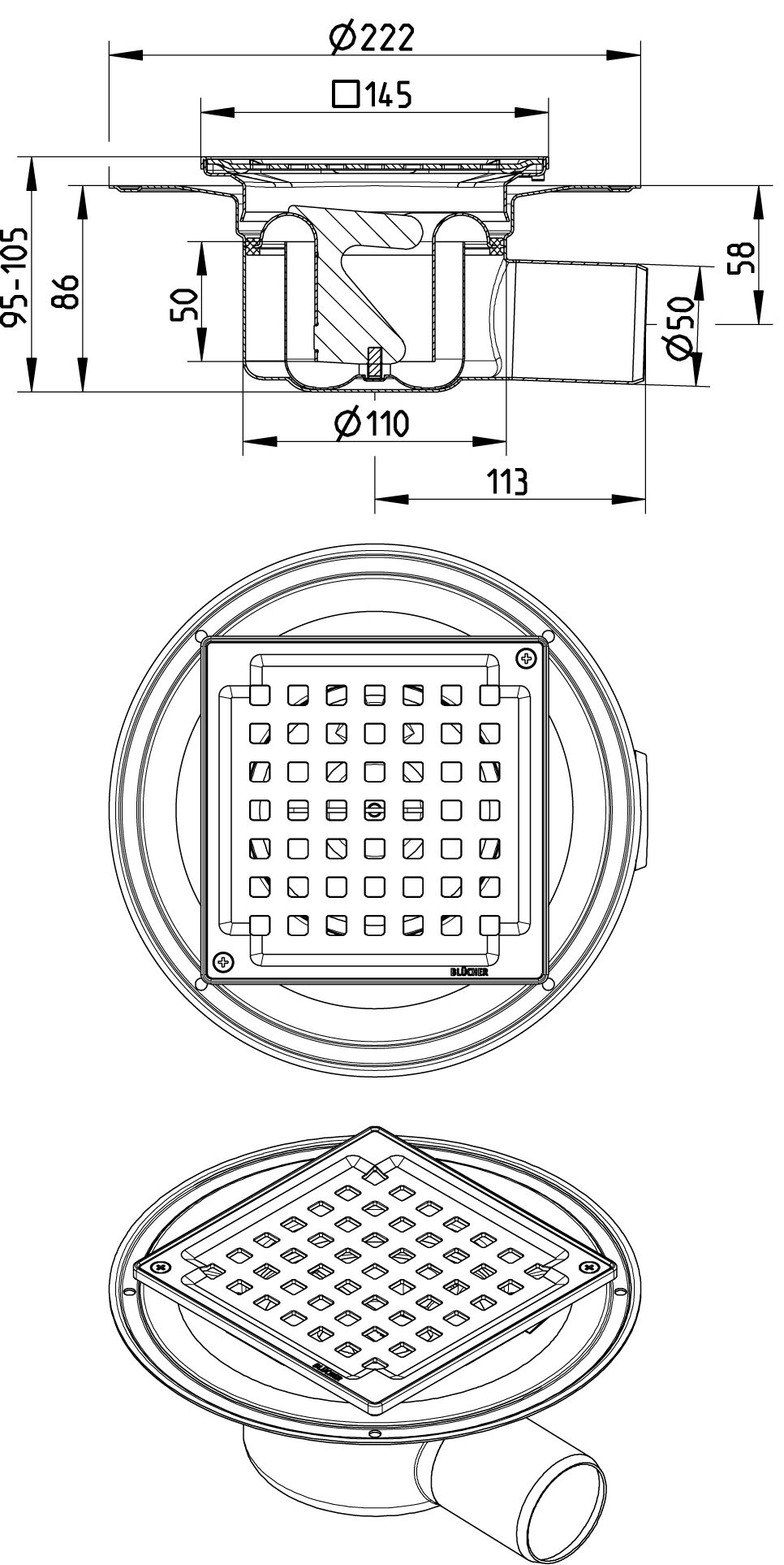 BLÜCHER wpust odpływ DN =50 mm, niski model, z kołnierzem do izolacji, z syfonem