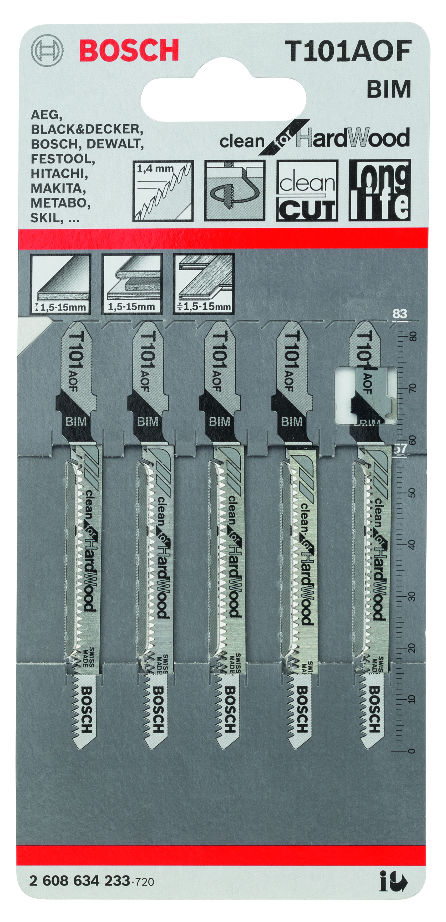 | Tekst produktu, osprzęt szary | T 101 AOF BIM, z zębami szpiczastymi, bok i zęby szlifowane Twarde drewno, laminaty (1,5-15 mm), płyty powlekane/HPL, sklejka, szczególnie do cięć krzywoliniowych, brak wyszczerbień |