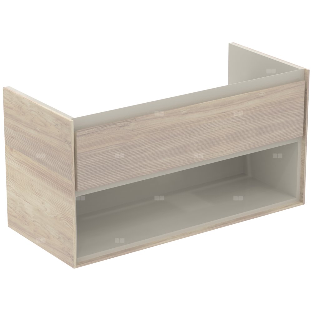 Wisząca 100 cm. 1 szuflada ze zintegrowanym uchwytem. Szuflady z systemem samodomykania. Otwarta dolna półka. Zestaw montażowy w komplecie. Szafka do skompletowania z: umywalką z powierzchniami bocznymi 104 cm E027401 lub. umywalką nablatową 60 cm E034801/40 cm E034701 z wymaganym blatem E0851. Zalecany: syfon oszczędzający przestrzeń EE23033967 (zamawiany oddzielnie).