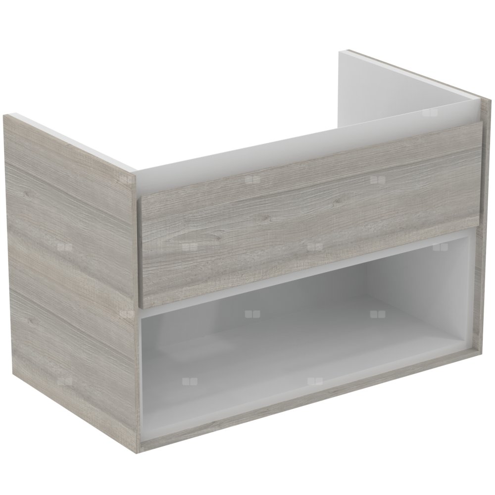 Wisząca 80 cm. 1 szuflada ze zintegrowanym uchwytem. Szuflady z systemem samodomykania. Otwarta dolna półka. Zestaw montażowy w komplecie. Szafka do skompletowania z: umywalką z powierzchniami bocznymi 64 cm E028901 lub. umywalką nablatową 60 cm E034801/40 cm E034701 z wymaganym blatem E0848. Zalecany: syfon oszczędzający przestrzeń EE23033967 (zamawiany oddzielnie).