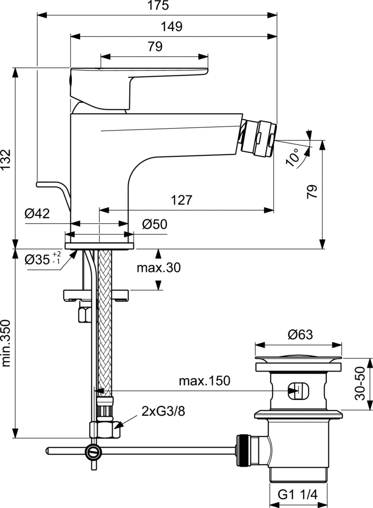 Głowica ceramiczna 28 mm z ogranicznikiem temperatury wody. Metalowy uchwyt z oznaczeniem wody ciepłej i zimnej. Aerator Ball-joint M18x1 - z ogranicznikiem przepływu wody do 5l/min. Wężyki przyłączeniowe PEX G3/8". Metalowy korek automatyczny. System montażu EASY-FIX. Zgodna z EN817. Kolor czarny mat - technologia malowania proszkowego.