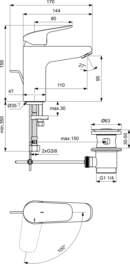 Bateria umywalkowa Grande z metalowym korkiem automatycznym. Głowica ceramiczna 40 mm z ogranicznikiem temperatury. Odlewany korpus z mosiądzu. Metalowy uchwyt z nadrukowanymi czerwonymi i niebieskimi oznaczeniami. Aerator typu Perlator, 5l/min. Wężyki przyłączeniowe G3/8”. System montażu EASY-FIX. Zgodność z EN817.
