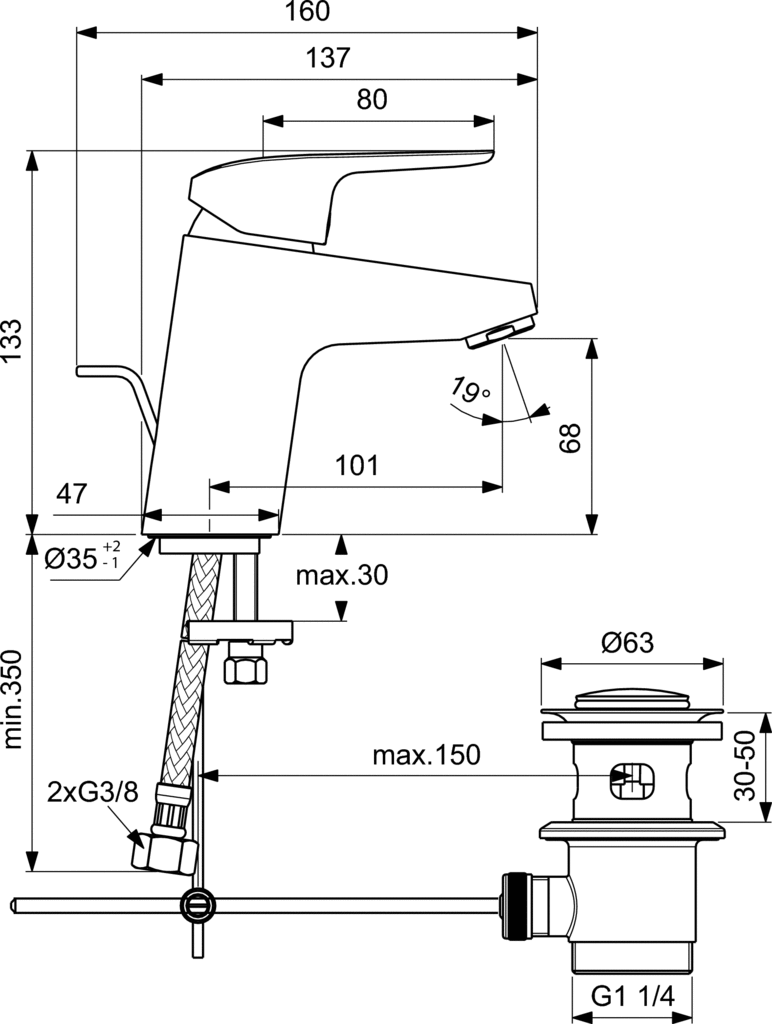 Głowica ceramiczna 40 mm z ogranicznikiem temperatury. Odlewany korpus z mosiądzu. Metalowy uchwyt z nadrukowanymi czerwonymi i niebieskimi oznaczeniami. Aerator typu Perlator, 5l/min. Metalowy korek automatyczny. Wężyki przyłączeniowe G3/8”. System montażu EASY-FIX. Zgodność z EN817.