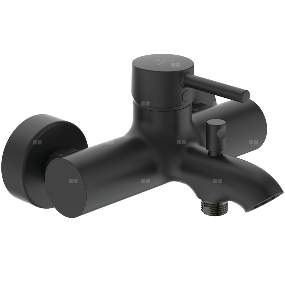 Bateria wannowa ścienna. Innowacyjna ceramiczna głowica FirmaFlow 38 mm, z ogranicznikiem temperatury. Metalowy uchwyt z nadrukowanymi czerwonymi i niebieskimi oznaczeniami. Zawór zwrotny. Przyłącza mimośrodowe z redukcją hałasu. Aerator typu Cache. Przełącznik automatyczny wanna/natrysk.