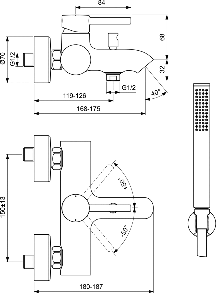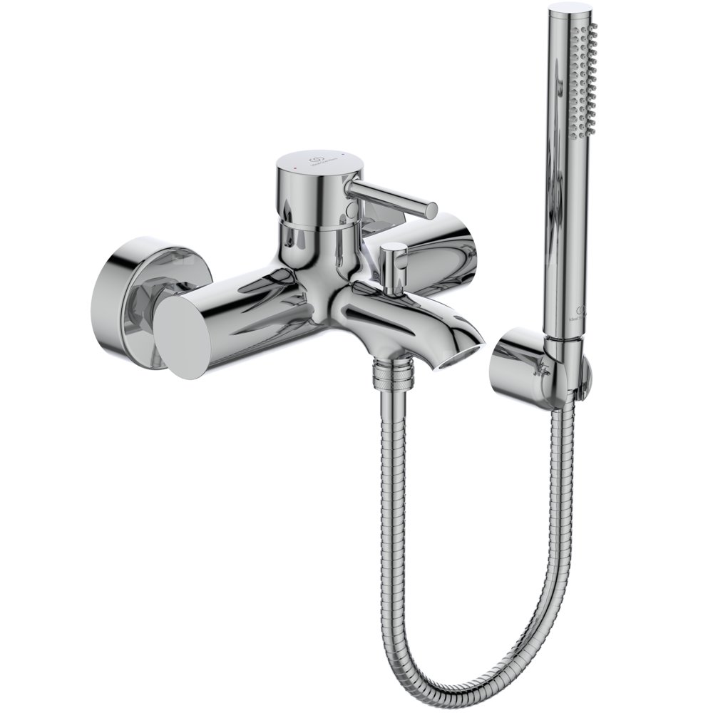 Głowica ceramiczna 38 mm z ogranicznikiem temperatury. Metalowy uchwyt z nadrukowanymi czerwonymi i niebieskimi oznaczeniami. Przełącznik automatyczny. Standardowe przyłącza ścienne. Aerator typu Cache. Zawór zwrotny. Akcesoria: 1 funkcyjna słuchawka natryskowa, metalowe mocowanie ścienne, wąż natryskowy 1750 mm.