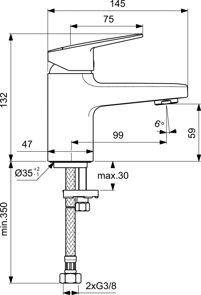 Bateria umywalkowa stojąca. Jednootworowa z obszarem Comfort pod aeratorem: 60 mm. Innowacyjna ceramiczna głowica FirmaFlow 38 mm z ogranicznikiem temperatury. Metalowy uchwyt z nadrukowanymi czerwonymi i niebieskimi oznaczeniami. Smukły aerator z ogranicznikiem przepływu wody do 5 l/min. System montażu Easy-Fix. Wężyki przyłączeniowe G3/8”.