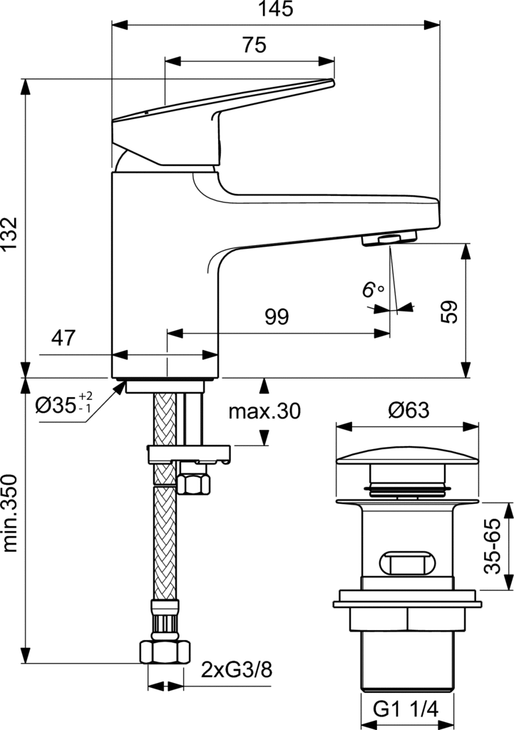 Bateria umywalkowa stojąca. Jednootworowa z obszarem Comfort pod aeratorem: 60 mm. Innowacyjna ceramiczna głowica FirmaFlow 38 mm z ogranicznikiem temperatury. Metalowy uchwyt z nadrukowanymi czerwonymi i niebieskimi oznaczeniami. Smukły aerator z ogranicznikiem przepływu wody do 5 l/min. System montażu Easy-Fix. Wężyki przyłączeniowe G3/8”. Korek Click-Clack.