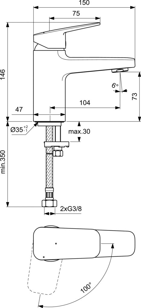 Bateria umywalkowa stojąca. Jednootworowa z obszarem Comfort pod aeratorem: 75 mm. Innowacyjna ceramiczna głowica FirmaFlow 38 mm z ogranicznikiem temperatury. Metalowy uchwyt z nadrukowanymi czerwonymi i niebieskimi oznaczeniami. Smukły aerator z ogranicznikiem przepływu wody do 5 l/min. System montażu Easy-Fix. Wężyki przyłączeniowe G3/8”. Technologia Blue Start.