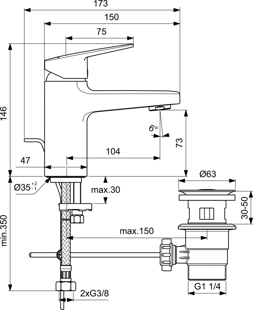 Bateria umywalkowa stojąca. Jednootworowa z obszarem Comfort pod aeratorem: 75 mm. Innowacyjna ceramiczna głowica FirmaFlow 38 mm z ogranicznikiem temperatury. Metalowy uchwyt z nadrukowanymi czerwonymi i niebieskimi oznaczeniami. Smukły aerator z ogranicznikiem przepływu wody do 5 l/min. System montażu Easy-Fix. Wężyki przyłączeniowe G3/8”. Plastikowy korek automatyczny.