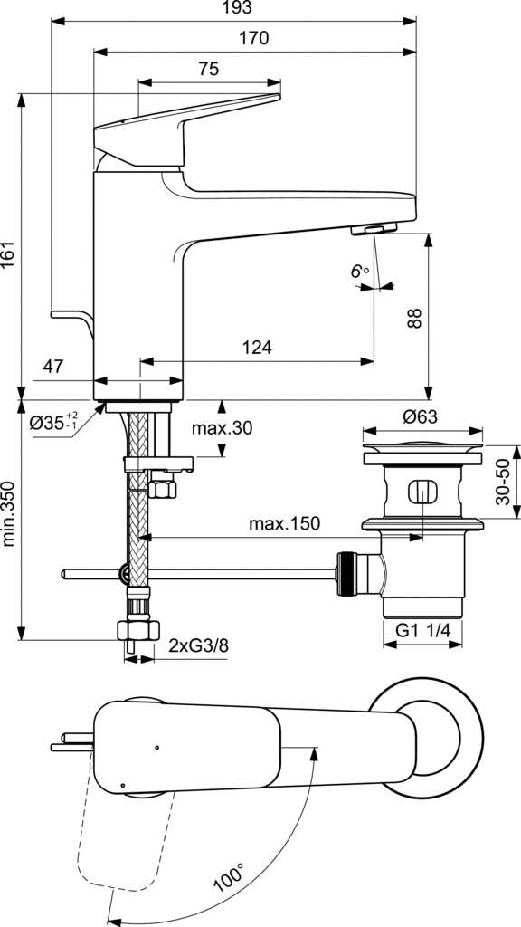 Bateria umywalkowa stojąca. Jednootworowa z obszarem Comfort pod aeratorem: 90 mm. Innowacyjna ceramiczna głowica FirmaFlow 38 mm z ogranicznikiem temperatury. Metalowy uchwyt z nadrukowanymi czerwonymi i niebieskimi oznaczeniami. Smukły aerator z ogranicznikiem przepływu wody do 5 l/min. System montażu Easy-Fix. Wężyki przyłączeniowe G3/8”. Technologia Blue Start. Metalowy korek automatyczny.