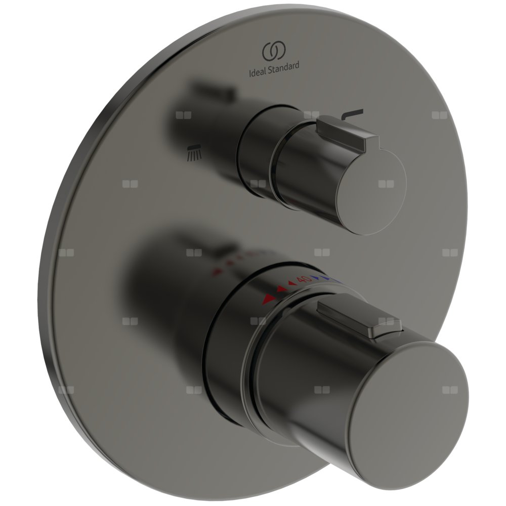 Zestaw montażowy baterii termostatycznej wannowo-natryskowej podtynkowej (część zewnętrzna). Z głowicą termostatyczną IS (nowa technologia). Dwudrożny ceramiczny zawór talerzowy włącz/wyłącz 90° ze zintegrowanym przełącznikiem. Bez akcesoriów w komplecie. Niezbędne wyposażenie: zestaw montażowy A1000NU (część wewnętrzna).