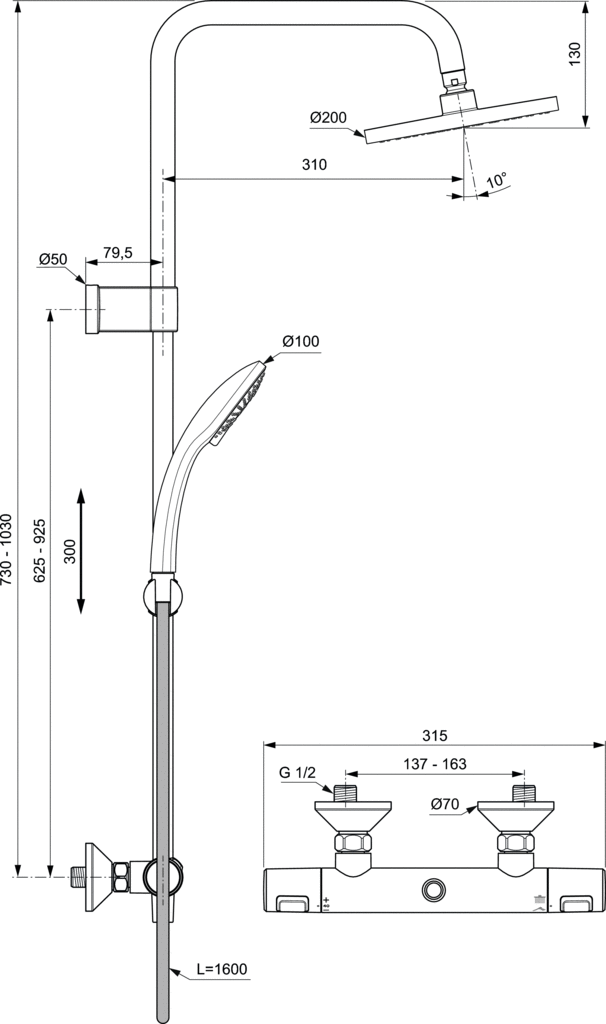 Zestaw natryskowy z baterią termostatyczną wannowo-natryskową ścienną Ceratherm T25. Przyłącza mimośrodowe. Głowica termostatyczna IS. Ceramiczny zawór talerzowy włącz/wyłącz 180°. Zintegrowany przełącznik w uchwycie. Manualny przełacznik bateria/wanna. Uchwyt z ogranicznikiem temperatury do 40°C i przyciskiem redukującym przepływ wody o 50%. Funkcja Cool Body, zapobiegająca ryzyku poparzenia przez nagrzany korpus baterii. Zawór zwrotny. Zgodność z normą EN1111. W zestawie: Plastikowa deszczownica Ø 200mm, z ogranicznikiem przepływu wody do 12 l/min. Trójfunkcyjna słuchawka prysznicowa Idealrain 100 mm, z ogranicznikiem przepływu wody do 8 l/min. Wąż natryskowy Idealflex, 1600 mm. Pozioma rura z funkcją teleskopową do 100 mm (regulacja możliwa tylko podczas montażu).