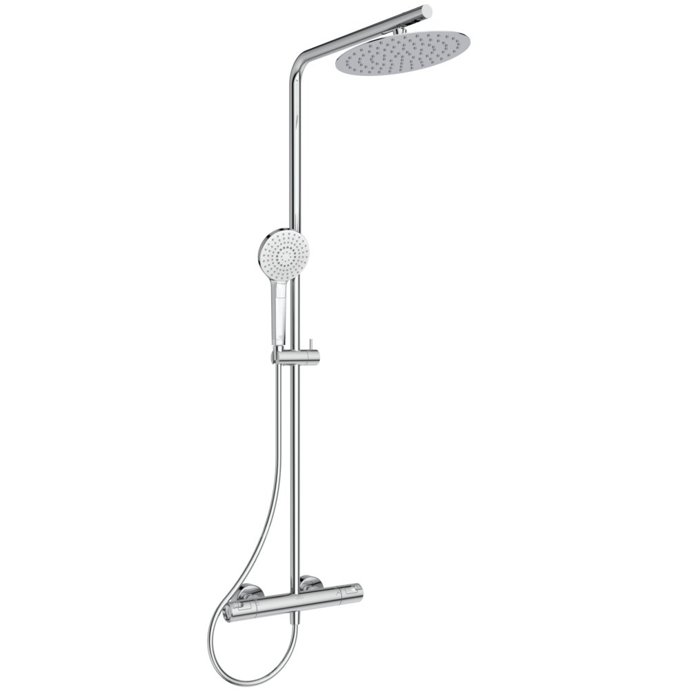 Zestaw natryskowy z baterią termostatyczną wannowo-natryskową ścienną Ceratherm T50. Przyłącza mimośrodowe. Głowica termostatyczna IS. Ceramiczny zawór talerzowy włącz/wyłącz 180°. Zintegrowany przełącznik w uchwycie. Manualny przełacznik bateria/wanna. Uchwyt z ogranicznikiem temperatury do 40°C i przyciskiem redukującym przepływ wody o 50%. Funkcja Cool Body, zapobiegająca ryzyku poparzenia przez nagrzany korpus baterii. Zawór zwrotny. Zgodność z normą EN1111. W zestawie: Metalowa deszczownica Ø 250mm, z ogranicznikiem przepływu wody do 12 l/min. Trójfunkcyjna słuchawka prysznicowa Idealrain 125 mm, z ogranicznikiem przepływu wody do 8 l/min. Wąż natryskowy Idealflex, 1750 mm. Pozioma rura z funkcją teleskopową do 100 mm (regulacja możliwa tylko podczas montażu). Przedłużenie do drążka natryskowego do 300 mm (regulacja możliwa tylko podczas montażu).