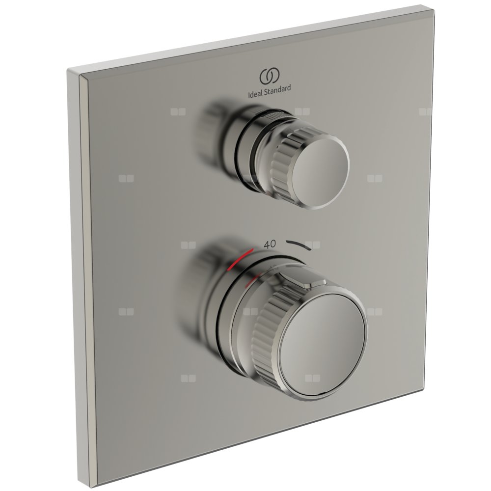Zestaw montażowy podtynkowej baterii termostatycznej natryskowej Ceratherm Navigo. Bateria z pojedynczym przyciskiem. Głowica FirmaFlow Therm z precyzyjną kontrolą temperatury. Uchwyt z ogranicznikiem temperatury do 40°C. Włączanie/wyłączanie odbywa się za pomocą wciskania przycisku a regulacja przepływu za pomocą jego obracania. Smukła, kwadratowa, metalowa rozeta. Uszczelniony szyld pod rozetę izolujący wodę od ściany. Do skompletowania z zestawem A1000NU (część wewnętrzna).