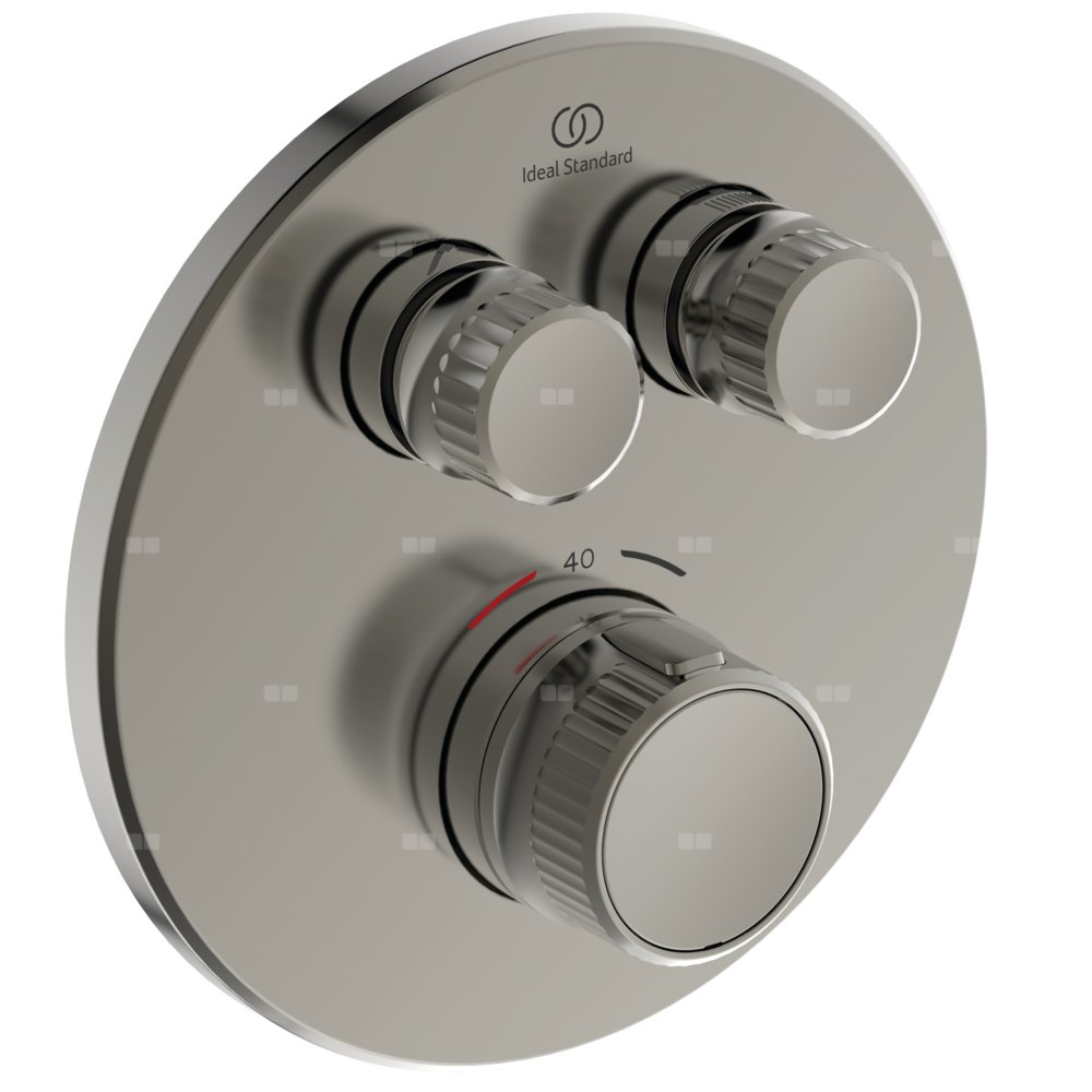 Zestaw montażowy podtynkowej baterii termostatycznej natryskowej Ceratherm Navigo. Bateria z dwomai przyciskami. Głowica FirmaFlow Therm z precyzyjną kontrolą temperatury. Uchwyt z ogranicznikiem temperatury do 40°C. Włączanie/wyłączanie odbywa się za pomocą wciskania przycisku a regulacja przepływu za pomocą obracania kolejnego. Smukła metalowa rozeta. Uszczelniony szyld pod rozetę izolujący wodę od ściany. Do skompletowania z zestawem A1000NU (część wewnętrzna).