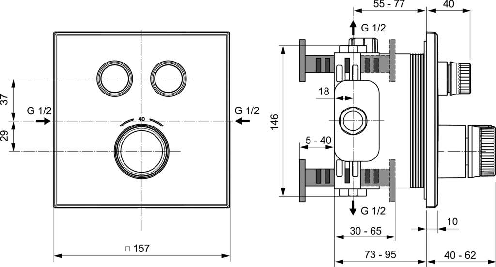 Zestaw montażowy podtynkowej baterii termostatycznej natryskowej Ceratherm Navigo. Bateria z dwomai przyciskami. Głowica FirmaFlow Therm z precyzyjną kontrolą temperatury. Uchwyt z ogranicznikiem temperatury do 40°C. Włączanie/wyłączanie odbywa się za pomocą wciskania przycisku a regulacja przepływu za pomocą obracania kolejnego. Smukła, kwadratowa, metalowa rozeta. Uszczelniony szyld pod rozetę izolujący wodę od ściany. Do skompletowania z zestawem A1000NU (część wewnętrzna).