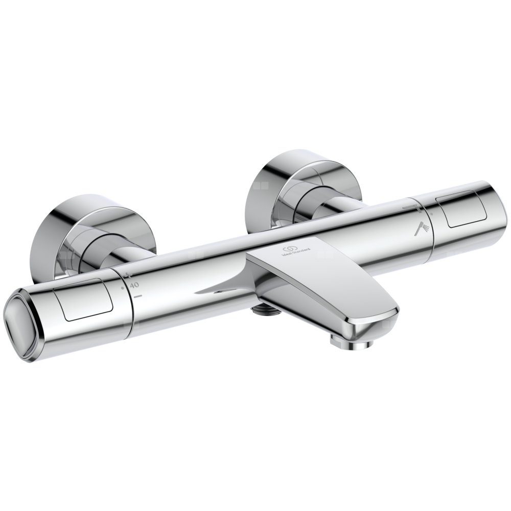 Bateria termostatyczna wannowo-natryskowa naścienna Ceratherm T100. Ukryte przyłącza mimośrodowe. Głowica termostatyczna IS nowej technologii. Ceramiczny zawór G1/2 180°. Brak acesoriów w komplecie. Zintegrowany przełącznik 180°. Diamentowy uchwyt z ogranicznikiem temperatury do 40°C i przyciskiem redukującym przepływ wody o 50%. Zawór zwrotny. Aerator typu Perlator.