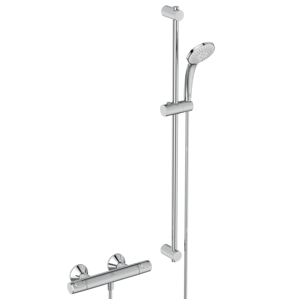 Bateria termostatyczna natryskowa naścienna Ceratherm T25. Standardowe przyłącza mimośrodowe. Głowica termostatyczna IS nowej technologii. Ceramiczny zawór G1/2 180°. Uchwyt z ogranicznikiem temperatury do 40°C i przyciskiem redukującym przepływ wody o 50%. Zawór zwrotny. W komplecie zestaw natryskowy: słuchawka natryskowa 100 mm 3-funkcyjna Idealrain, z ogranicznikiem przepływu 8l/min oraz wąż natryskowy 1250 mm Idealflex i drążek natryskowy 600 mm z regulacją punktów mocowania do ściany. Zalecane dodatkowe elementy: Nakładana półka do baterii termostatycznych Ceratherm T25, T50 i T100 A7215AA.