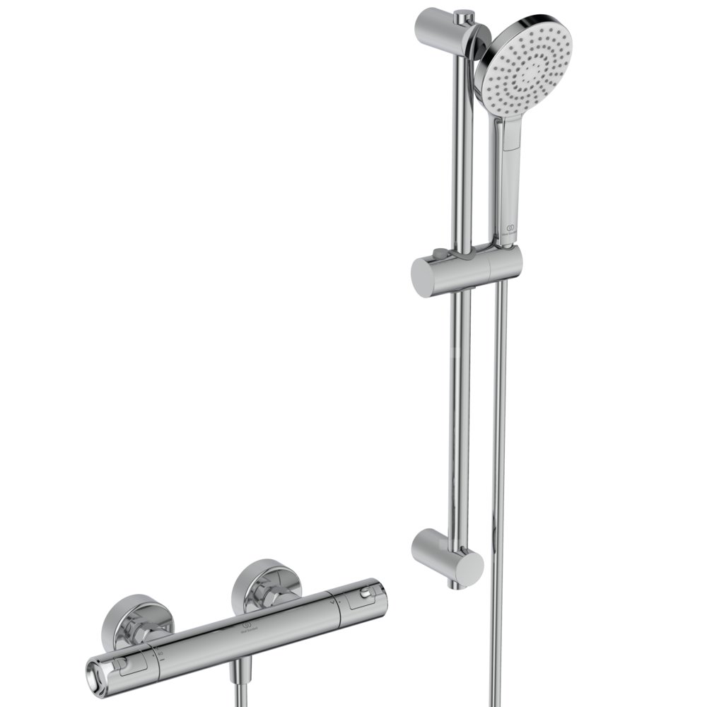 System natryskowy Ceratherm T50 z akcesoriami. Standardowe przyłącza mimośrodowe. Głowica termostatyczna IS nowej technologii. Ceramiczny zawór G1/2 180°. Uchwyt z ogranicznikiem temperatury do 40°C i przyciskiem redukującym przepływ wody o 50%. Zawór zwrotny. W komplecie system natryskowy: słuchawka natryskowa 110 mm 3-funkcyjna Idealrain Evo Round, z ogranicznikiem przepływu 8l/min oraz wąż natryskowy 1750 mm Idealflex i drążek natryskowy 600 mm z regulacją punktów mocowania do ściany. Zalecane dodatkowe elementy: Nakładana półka do baterii termostatycznych Ceratherm T25, T50 i T100 A7215AA.