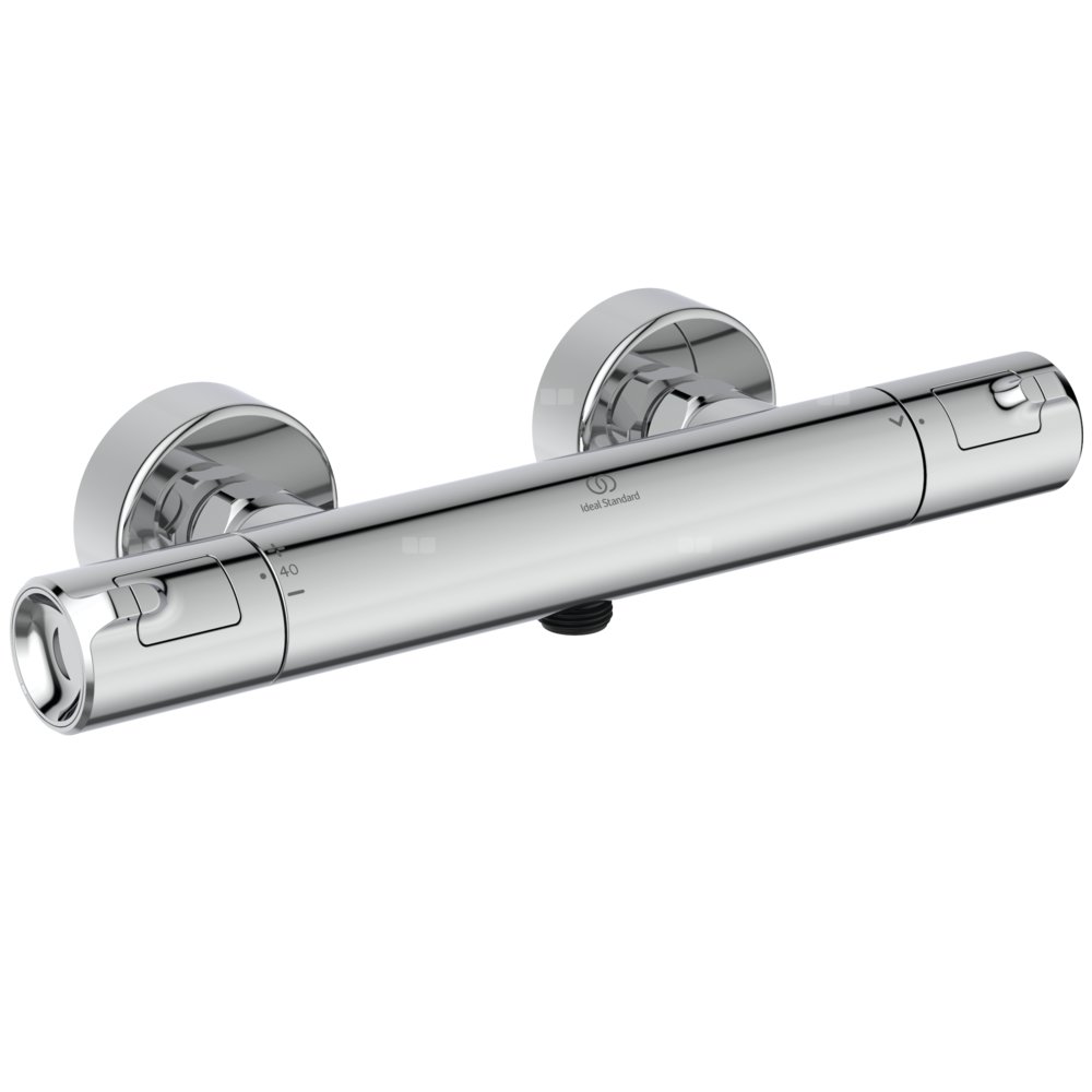 Bateria termostatyczna natryskowa naścienna Ceratherm T25. Standardowe przyłącza mimośrodowe. Głowica termostatyczna IS nowej technologii. Ceramiczny zawór G1/2 180°. Brak akcesoriów w komplecie. Uchwyt z ogranicznikiem temperatury do 40°C i przyciskiem redukującym przepływ wody o 50%. Zawór zwrotny. Zalecane dodatkowe elementy: Nakładana półka do baterii termostatycznych Ceratherm T25, T50 i T100 A7215AA.