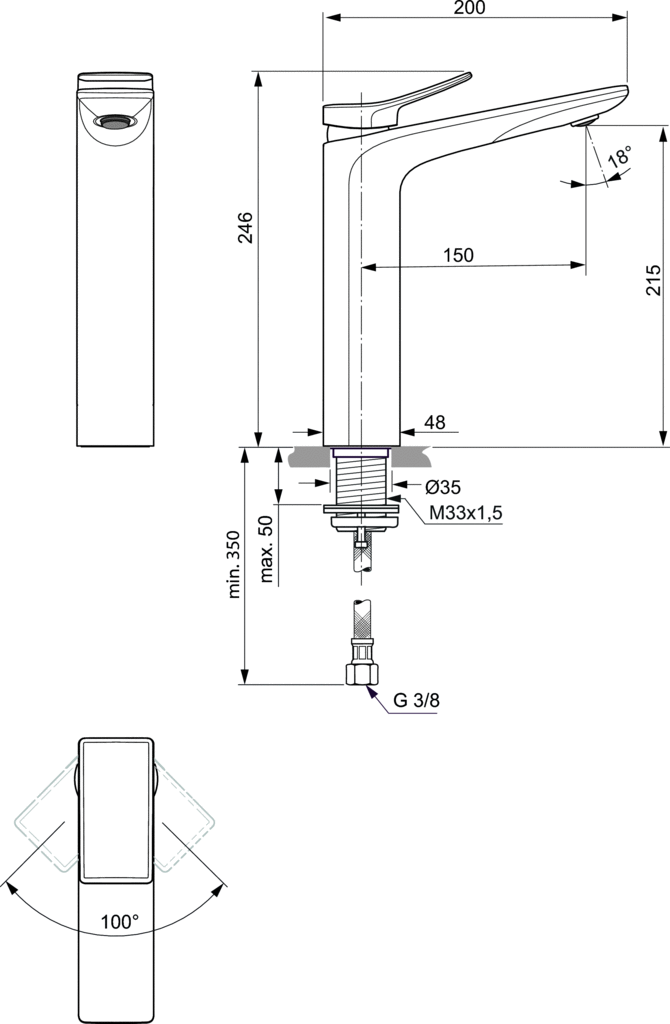Głowica ceramiczna 28 mm z ogranicznikiem temperatury wody. Logo Ideal Standard umieszczone na korpusie baterii. Metalowy uchwyt bez oznaczeń. Aerator M24x1 z ogranicznikiem przepływu wody do 5 l/min. System montażu EASY-FIX. Wężyki przyłączeniowe G3/8". Kolory/wykończenia, technologia wielowarstwowa PVD.