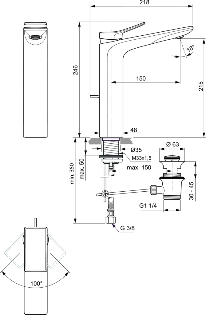 Głowica ceramiczna 28 mm z ogranicznikiem temperatury wody. Logo Ideal Standard umieszczone na korpusie baterii. Metalowy uchwyt bez oznaczeń. Aerator M24x1 z ogranicznikiem przepływu wody do 5 l/min. System montażu EASY-FIX. Wężyki przyłączeniowe G3/8". Metalowy korek automatyczny. Kolory/wykończenia, technologia wielowarstwowa PVD.