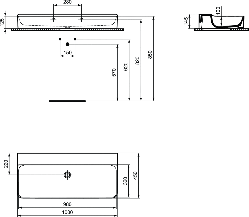 Umywalka mocowana do ściany bez przelewu. Opcjonalnie: rekomendowany zestaw montażowy WW965340, dekoracyjny syfon G1 1/4 E0079AA (do montażu z/bez pólpostumentu lub podstawowej szafki), zawór kątowy odcinający A3491AA; Rozeta do syfonu G1 1/4 (do montażu z baterią bez korka automatycznego) - B4801AA.