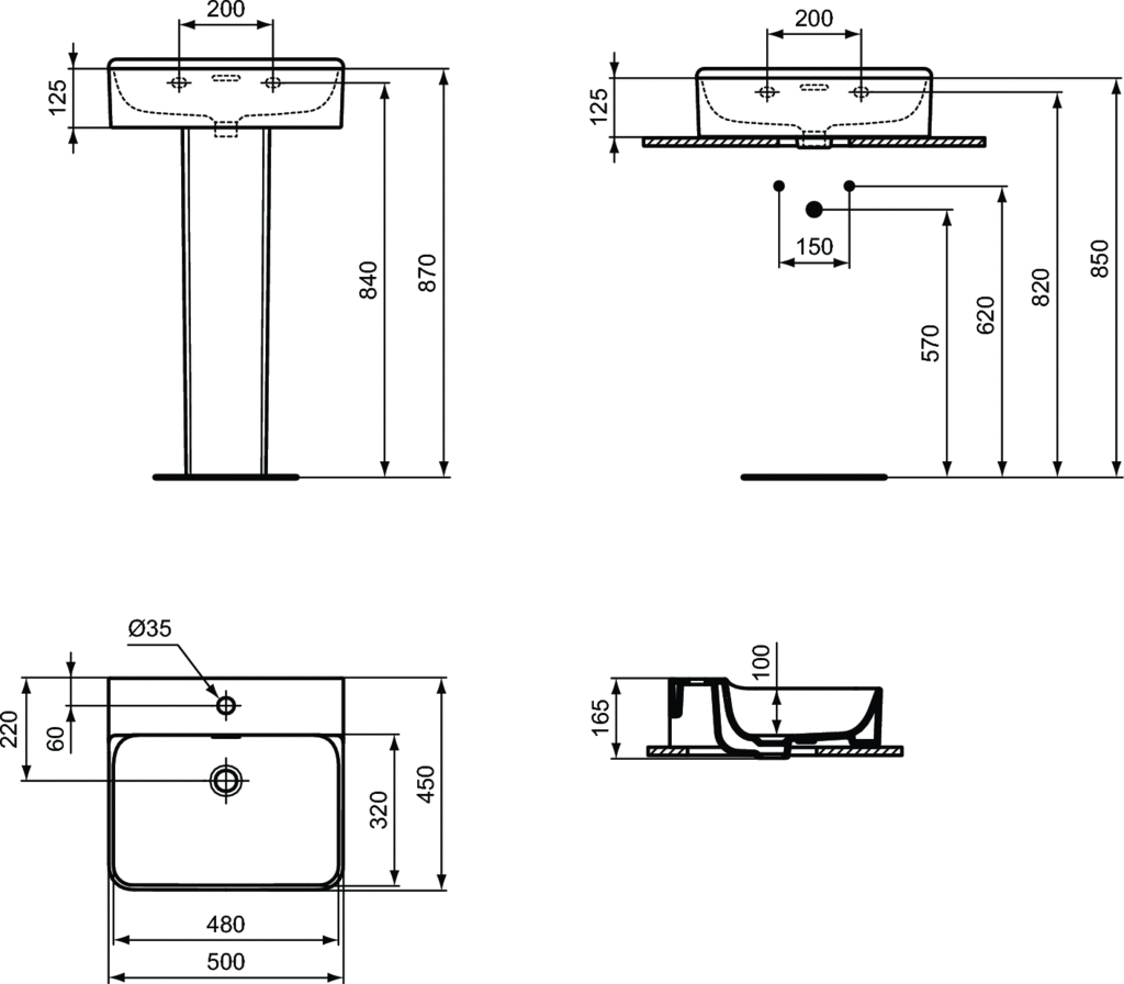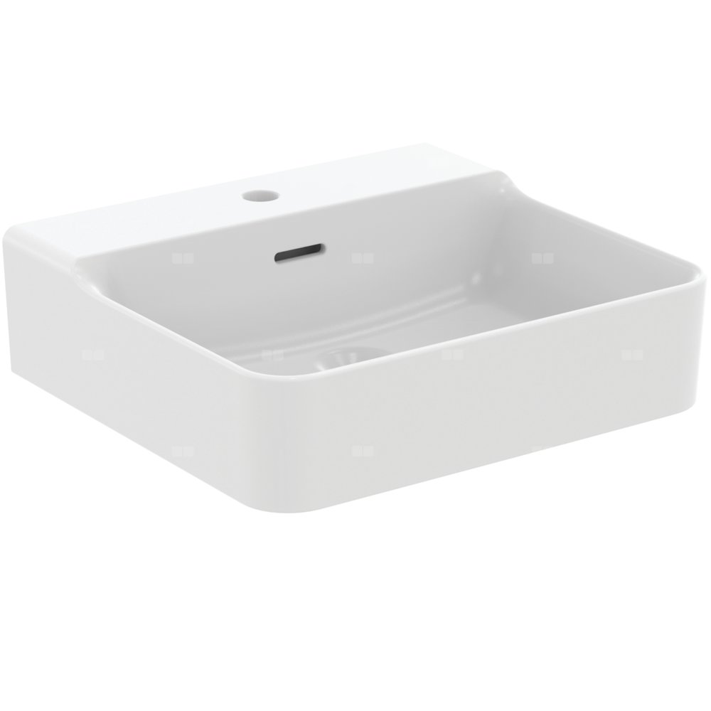 Umywalka Conca mocowana do ściany z 1 wybitym otworem na baterię oraz przelewem (kształt szczelinowy).