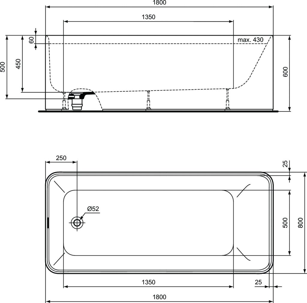 Wanna monolityczna wykonana w jednej cześci z materiału Solid Surface. Solid Surface - wysokiej jakości materiał kompozytowy wysoce odporny na uszkodzenia, zarysowania i osad kamienia. W komplecie zestaw odpływowo-przelewowy typu Click- clack z pokrywą korka wykonaną z Solid Surface materiału. Otwór przelewu typu slot - szerokość: 80mm,  wysokość: 8mm. Kolor wykończenie powierzchni - mat. Waga: 175 kg. Pojemność 430l. CE zgodność z EN 14516.
