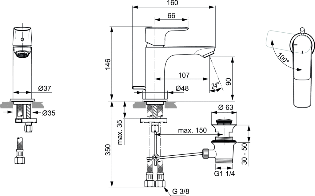 Bateria umywalkowa z metalowym automatycznym korkiem. Smukły metalowy korpus 37 mm. Aerator typu Perlator M24x1. Głowica ceramiczna 28 mm. Metalowy uchwyt z nadrukowanymi czerwonymi i niebieskimi oznaczeniami. Technologia Cold Start - wypływ zimnej wody. Elastyczne wężyki przyłączeniowe PEX G3/8".
