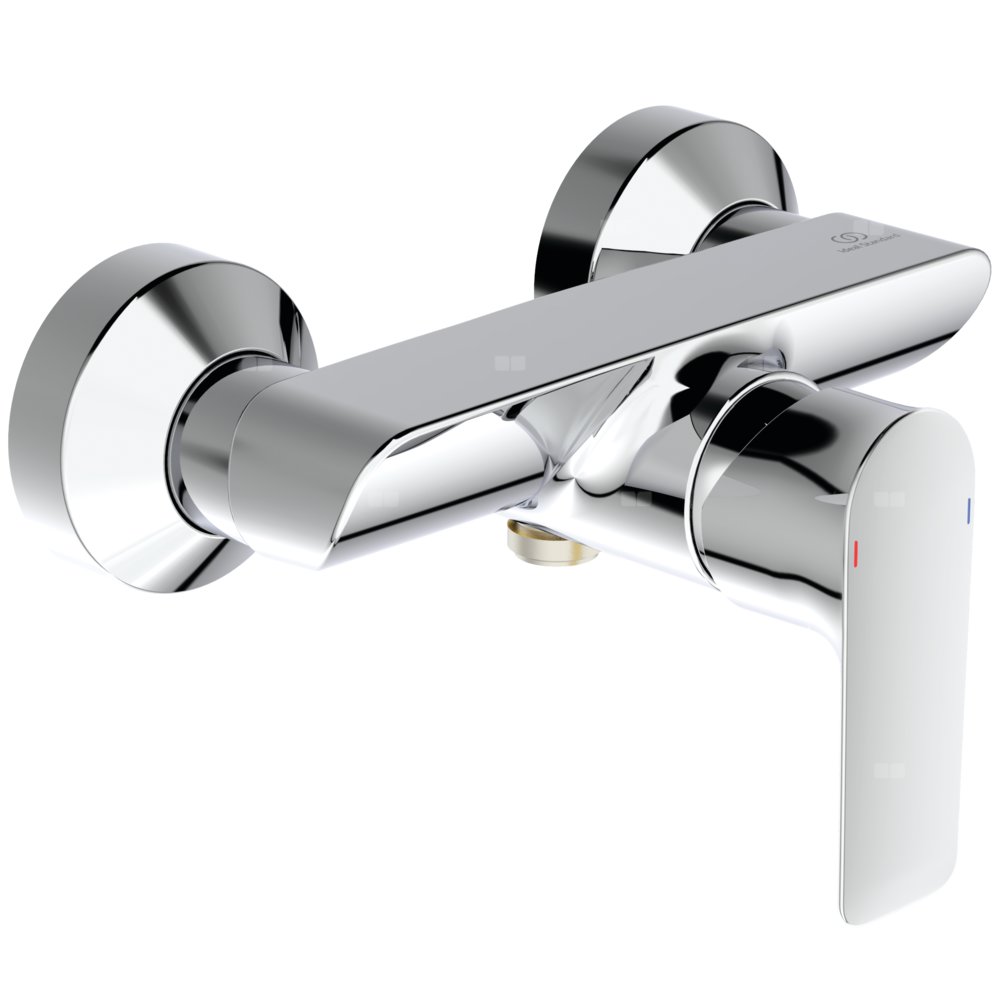Bateria natryskowa ścienna z głowicą ceramiczną 38 mm FirmaFlow z ogranicznikiem temperatury HWTC. Brak funkcji Click. Mosiężny, odlewany korpus. Metalowy uchwyt z nadrukowanymi czerwonymi i niebieskimi oznaczeniami. Standardowe przyłącza ścienne S-Connection z redukcją hałasu. Zawór zwrotny, osłona śrub przyłączeniowych.