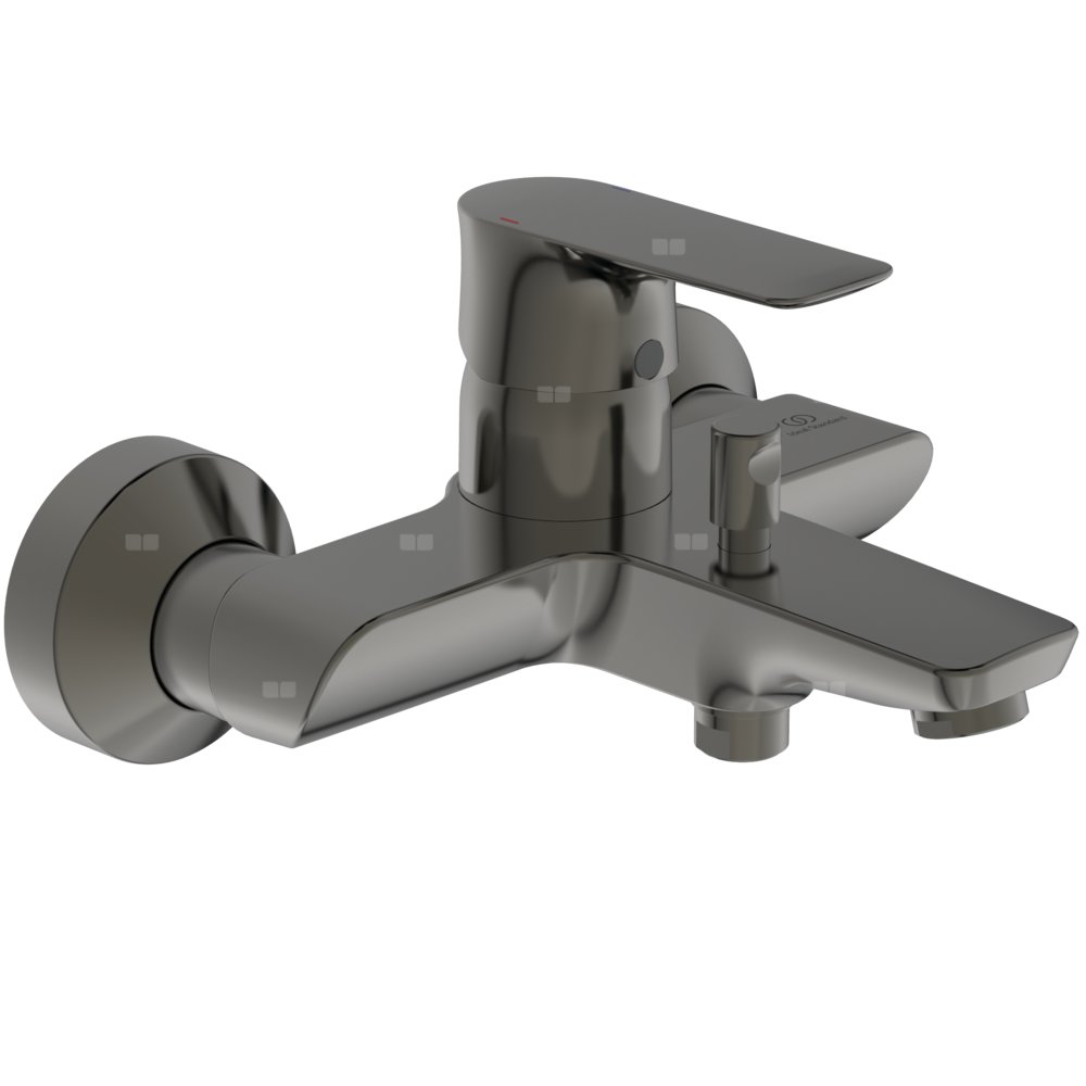 Bateria wannowo-natryskowa ścienna. Głowica ceramiczna 38 mm FirmaFlow z ogranicznikiem temperatury HWTC. Brak funkcji Click, przełącznik automatyczny. Mosiężny, odlewany korpus. Metalowy uchwyt z nadrukowanymi czerwonymi i niebieskimi oznaczeniami. Standardowe przyłącza ścienne S-Connection z redukcją hałasu. Perlator typu Cascade z regulacją kierunku strumienia. Zawór zwrotny, osłona śrub przyłączeniowych.