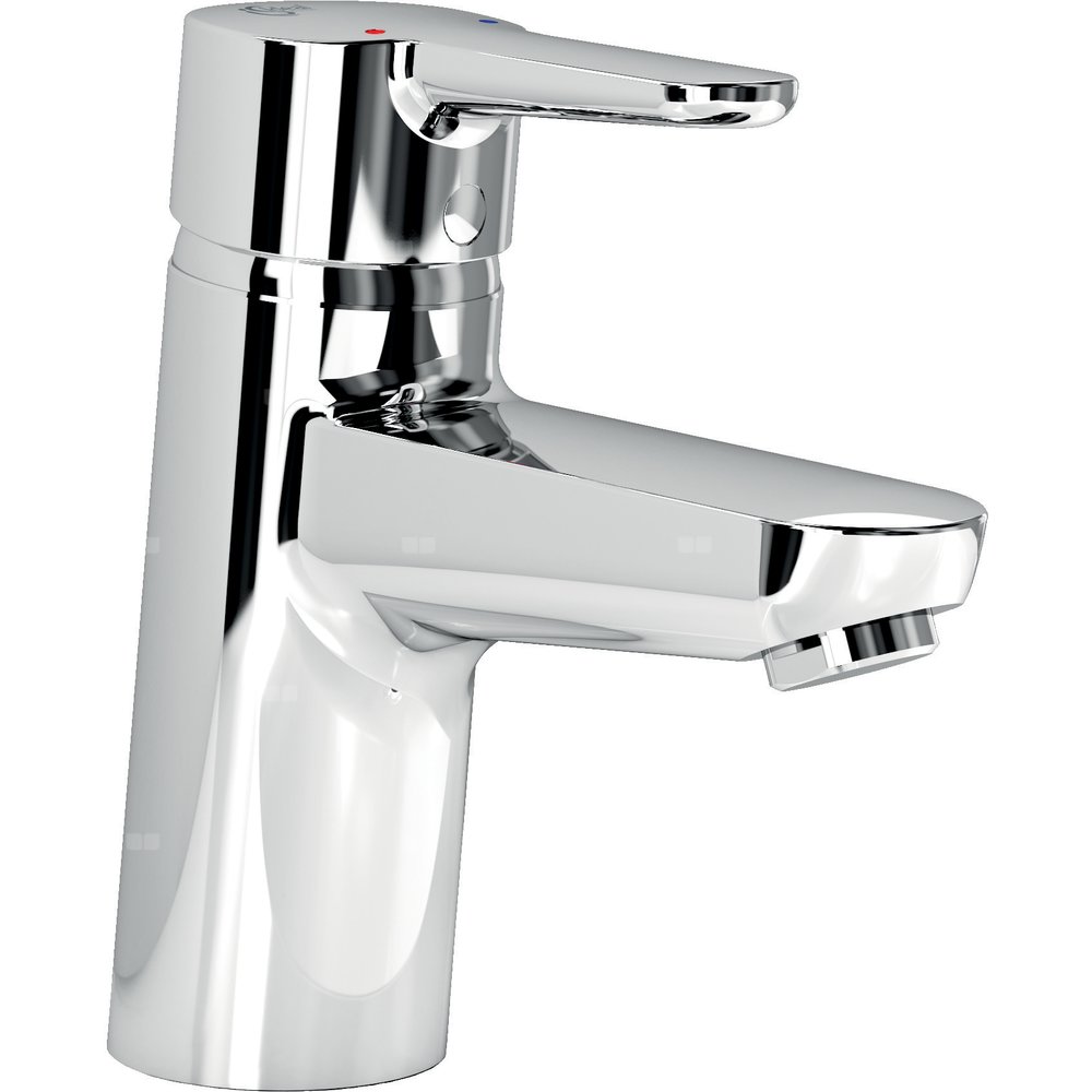Bateria umywalkowa jednootworowa. Głowica 40 mm CLICK z funkcją ECO i ograniczeniem temperatury wody. Wężyki przyłączeniowe typu PEX G3/8". Areator typu Cascade M24x1. Metalowy uchwyt z nadrukowanymi czerwonymi i niebieskimi oznaczeniami. System montażu EASY-FIX. Metalowy pierścień. Bez korka automatycznego.