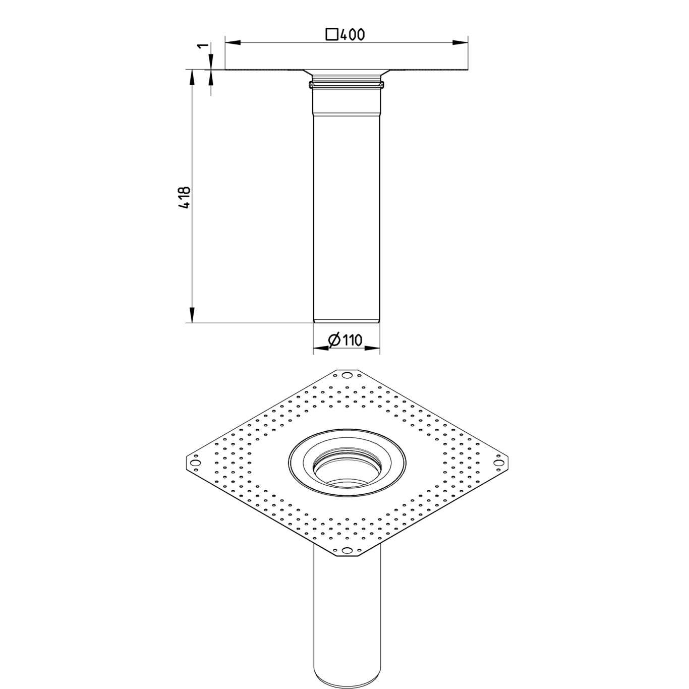 Dolna część DN =110mm z pojedynczym kołnierzem do papy, H=418