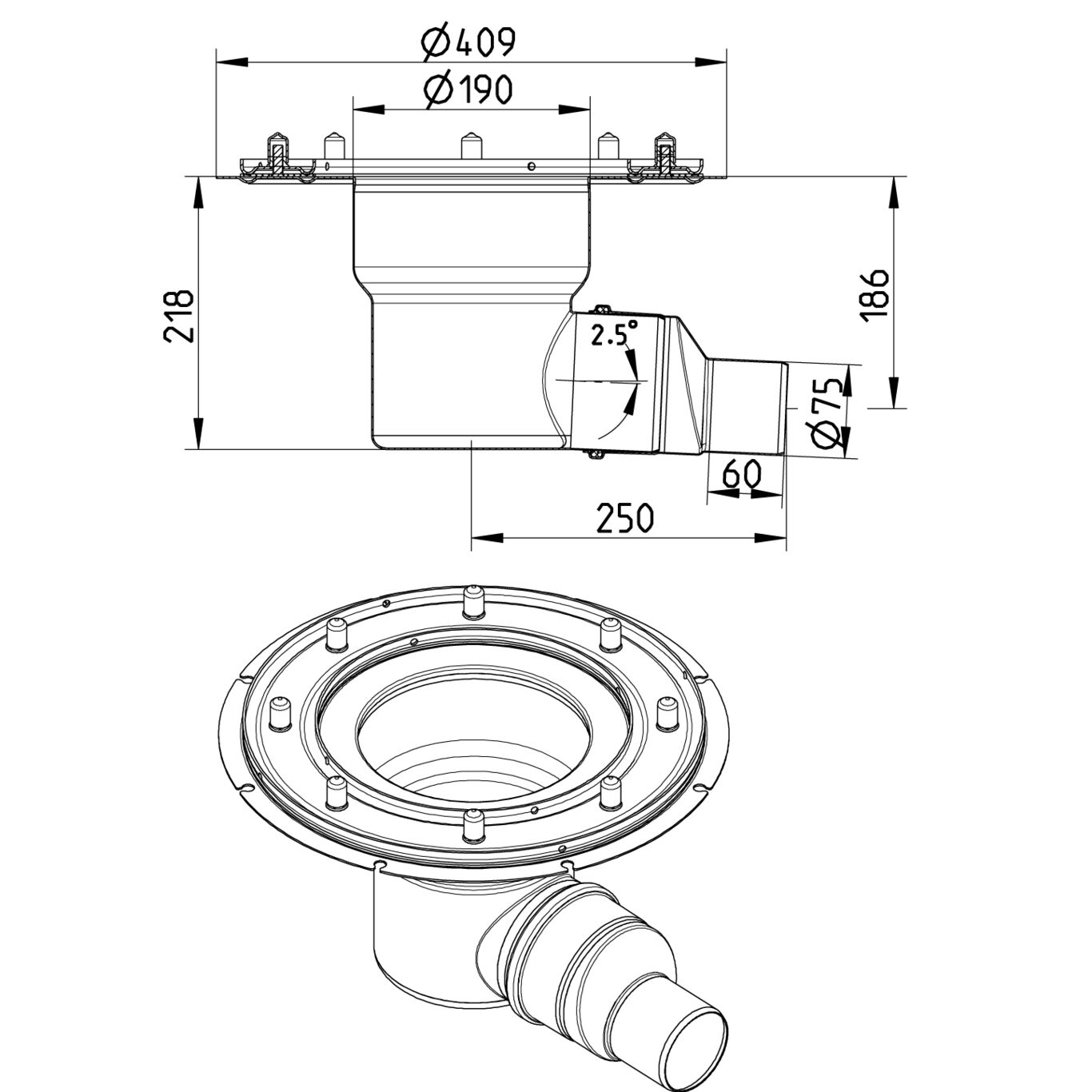 Dolna część do kanałów, odpływ poziom z redukcją 160/75, z kołnierzem do izolacji suchej, stal kwasoodporna
