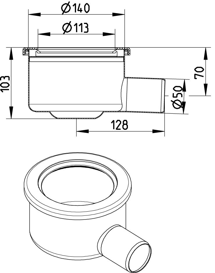 Dolna część regulowanego wpustu, odpływ poziomy DN =50 mm