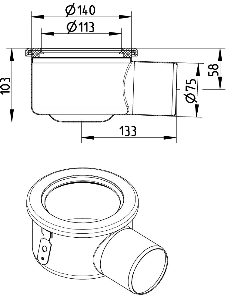 Dolna część regulowanego wpustu, odpływ poziomy DN 75 mm