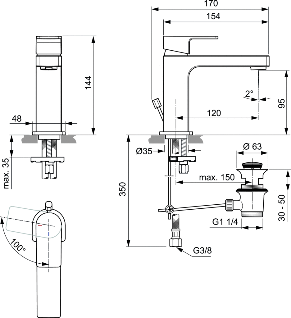 Bateria umywalkowa z metalowym korkiem automatycznym. Głowica ceramiczna IS 28 mm. Metalowy uchwyt z logo Ideal Standard oraz nadrukowanymi czerwonymi i niebieskimi oznaczeniami. Aerator typu Perlator M24x1 - z ogranicznikiem przepływu wody do 5l/min. Technologia Blue Start. Metalowy pierścień uszczelniający. Klasa akustyczna 1. Wężyki przyłączeniowe PEX G3/8". System montażu EASY-FIX. Zgodna z EN817.